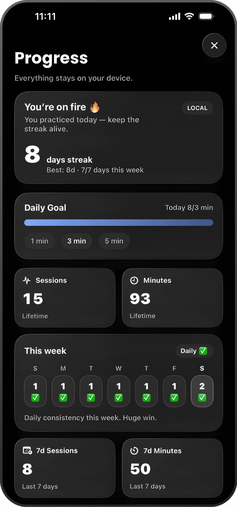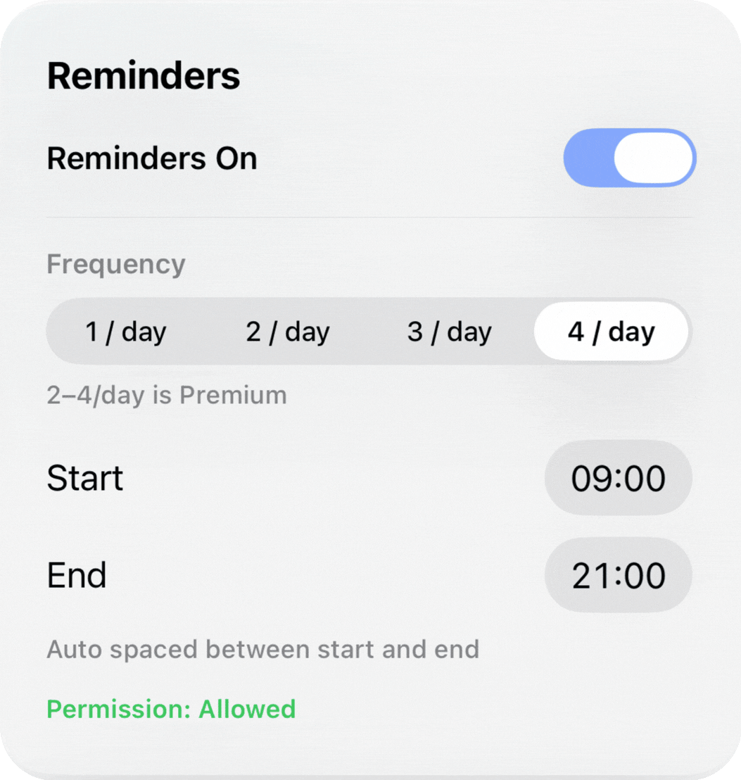 Small breathing reminders help you reset before distractions take over. Set up to four reminders throughout your day.