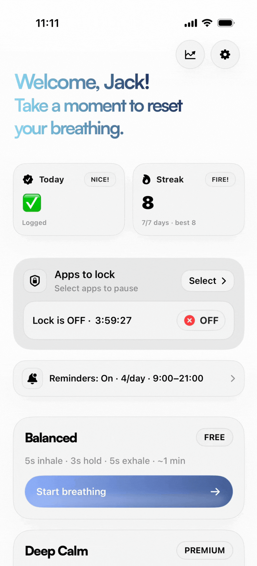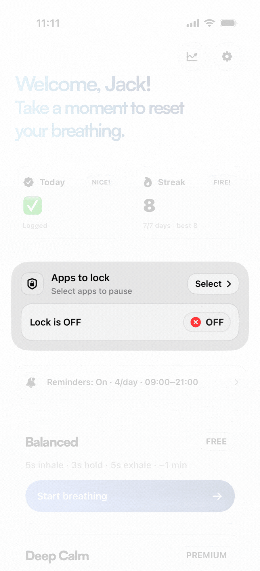 In a world full of constant notifications and endless scrolling, BreathLock gives you space to pause, slow down, and reconnect with your focus. A single moment of breathing can bring your attention back to what truly matters.