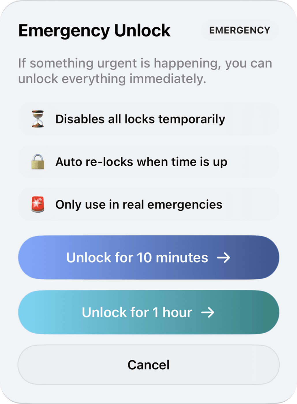 If something urgent happens, temporarily disable app locks without breaking your focus habit.